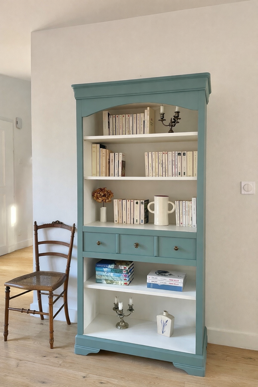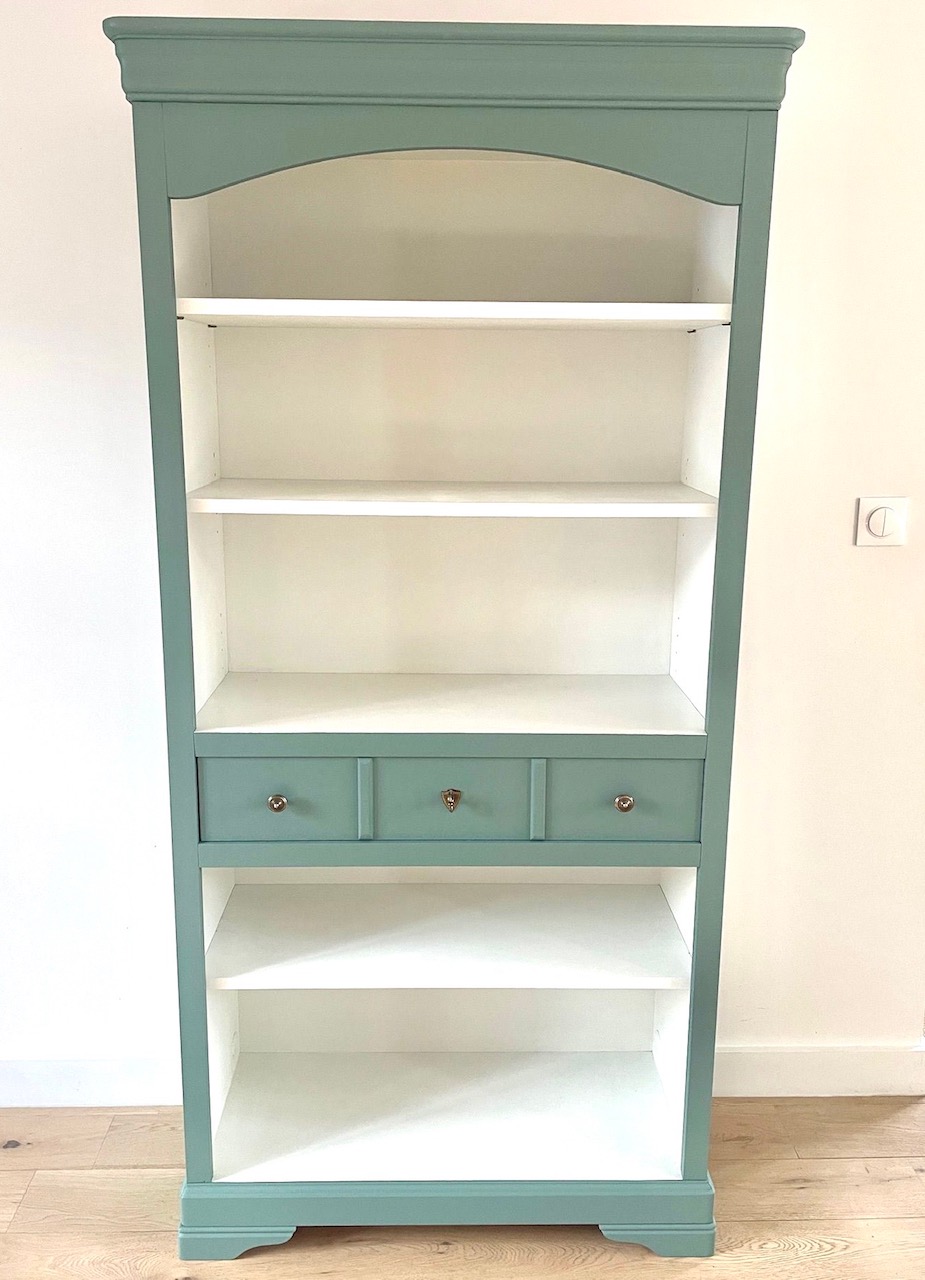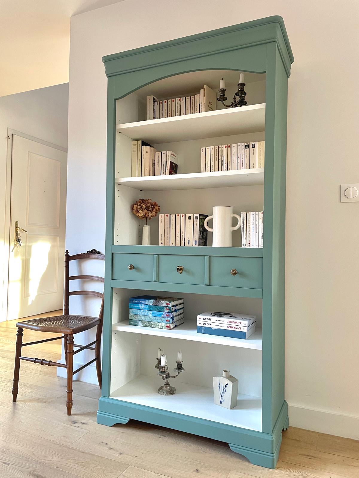 Repeinte dans le coloris vert Agave de chez Camaëlle Peintures à l’extérieur et sur le tiroir central.