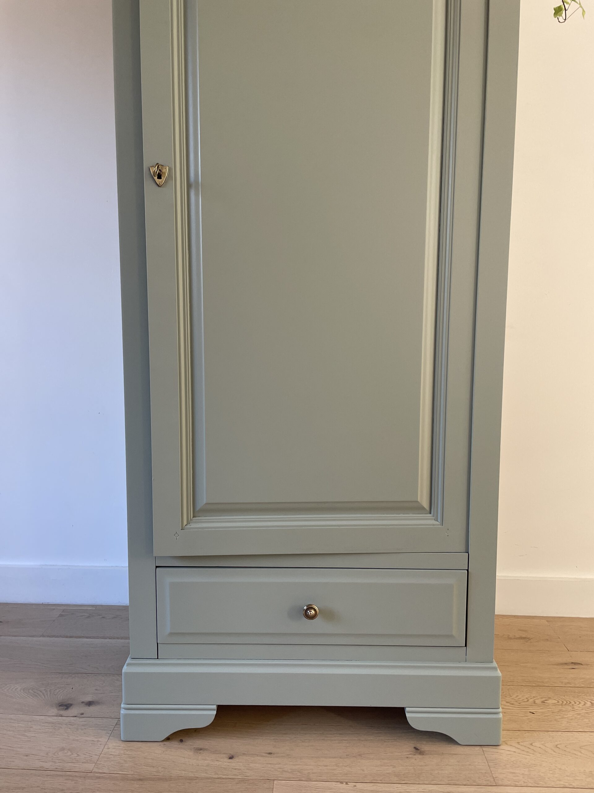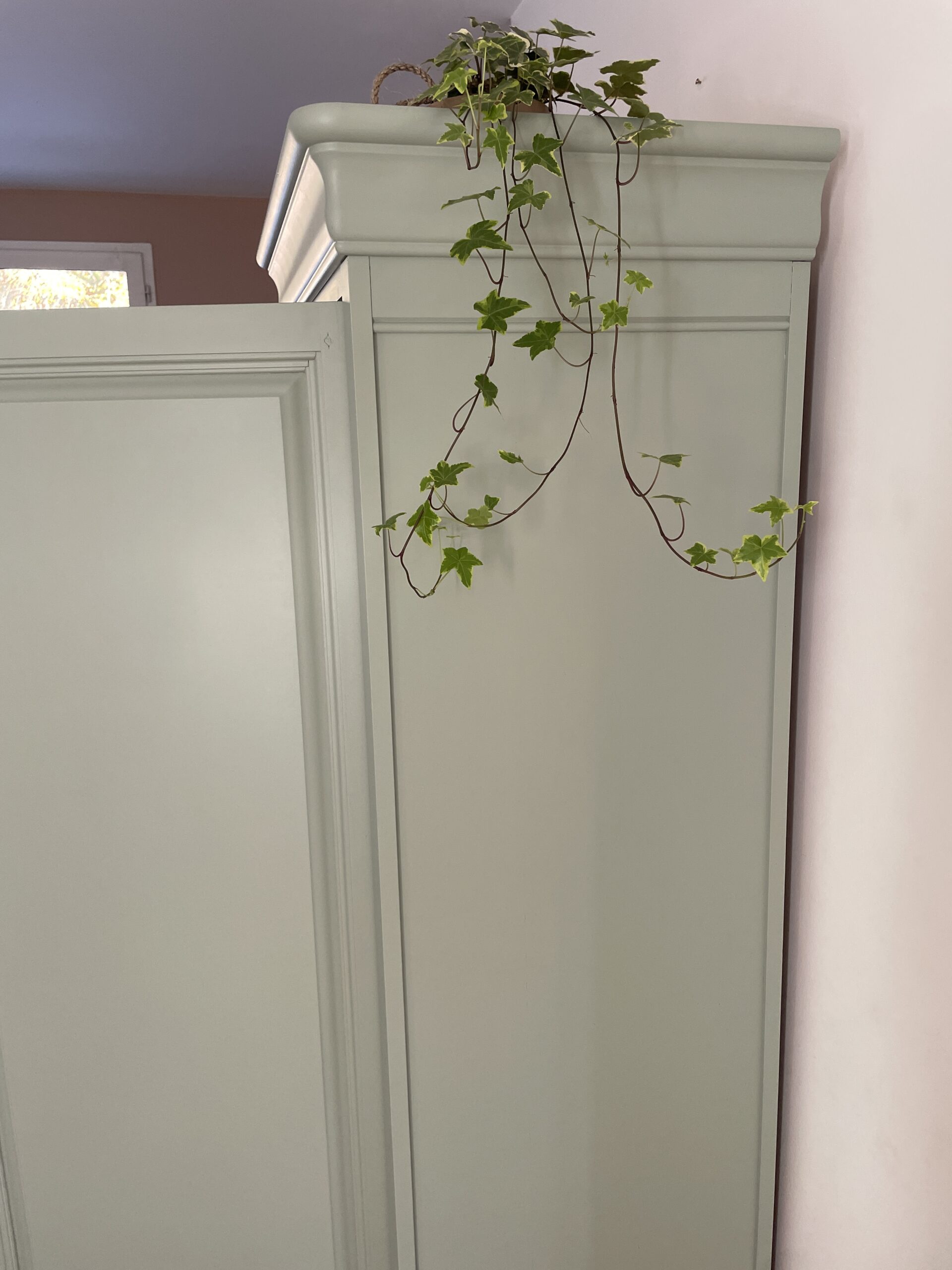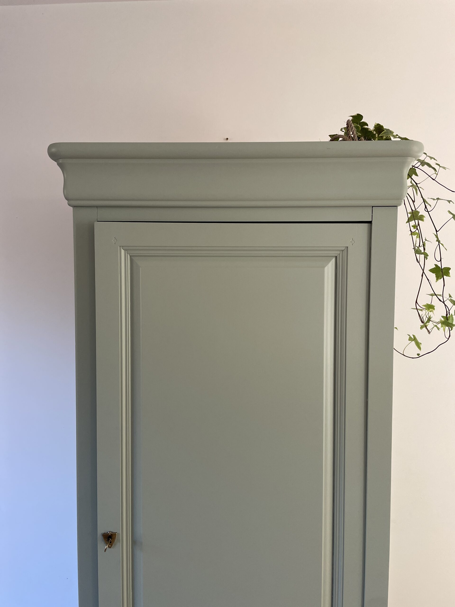 Armoire repeinte en couleur vert amande à l’extérieur et en blanc à l’intérieur. Peinture Camaëlle biosourcée, fabriquée en France.