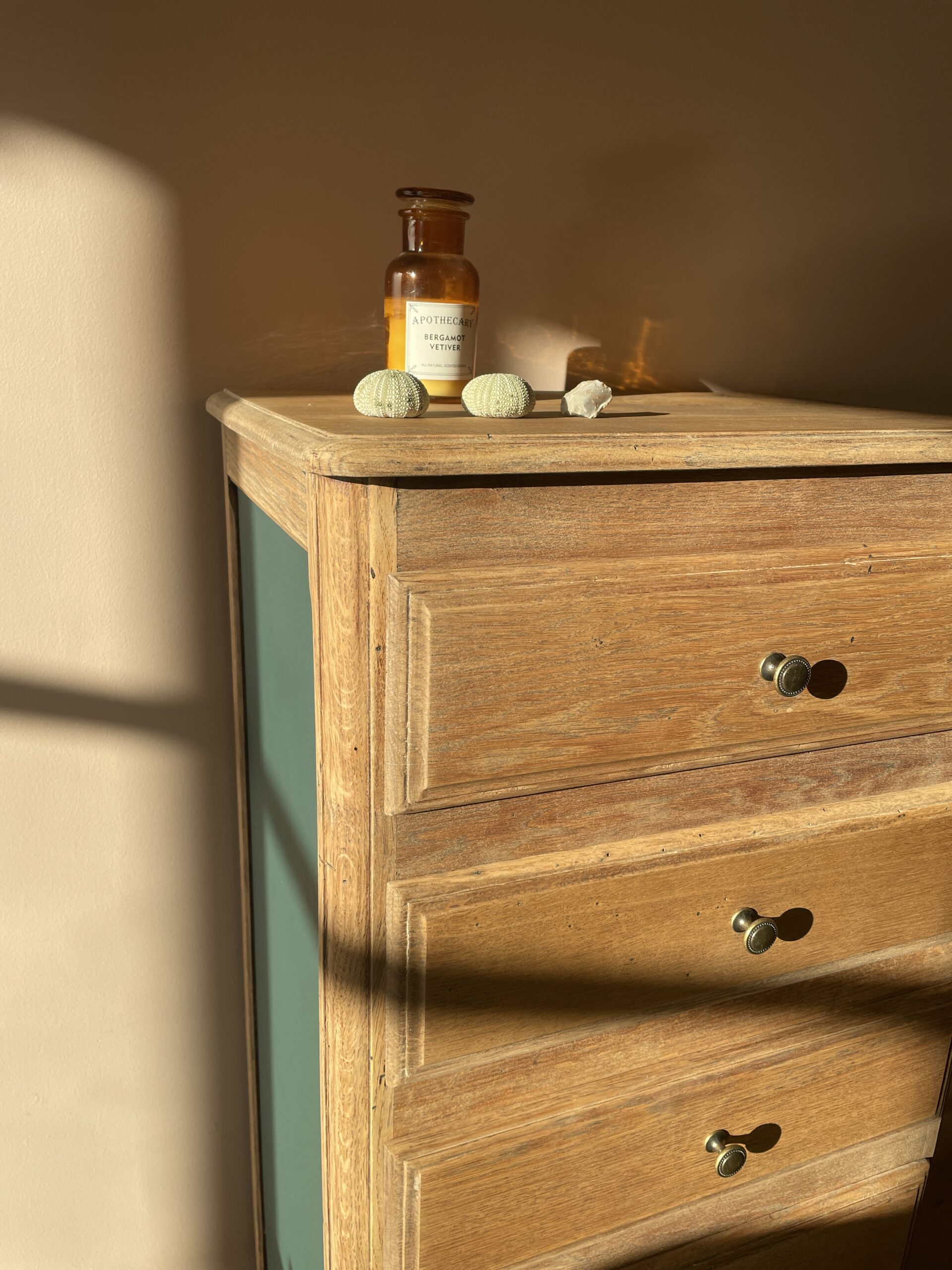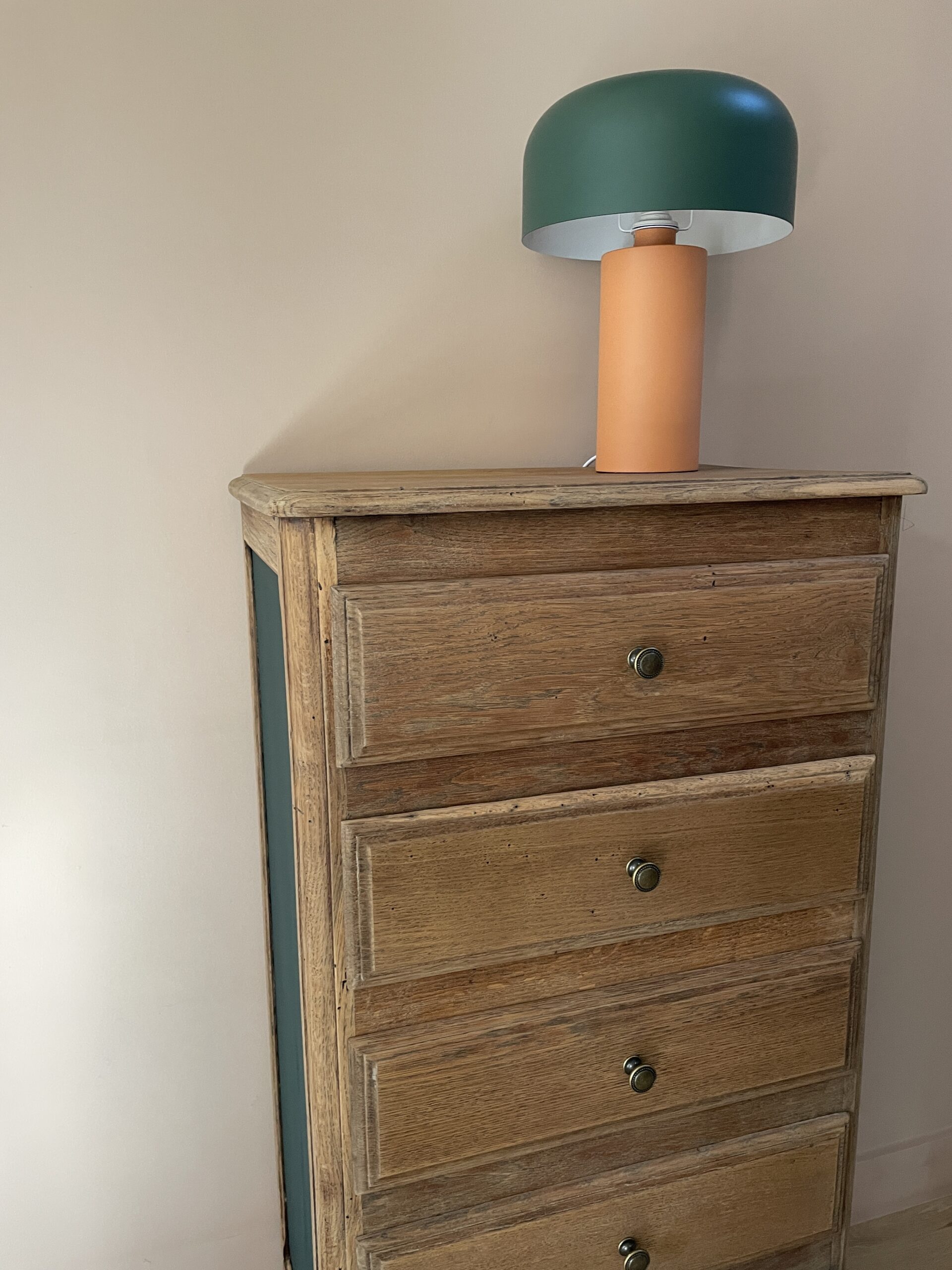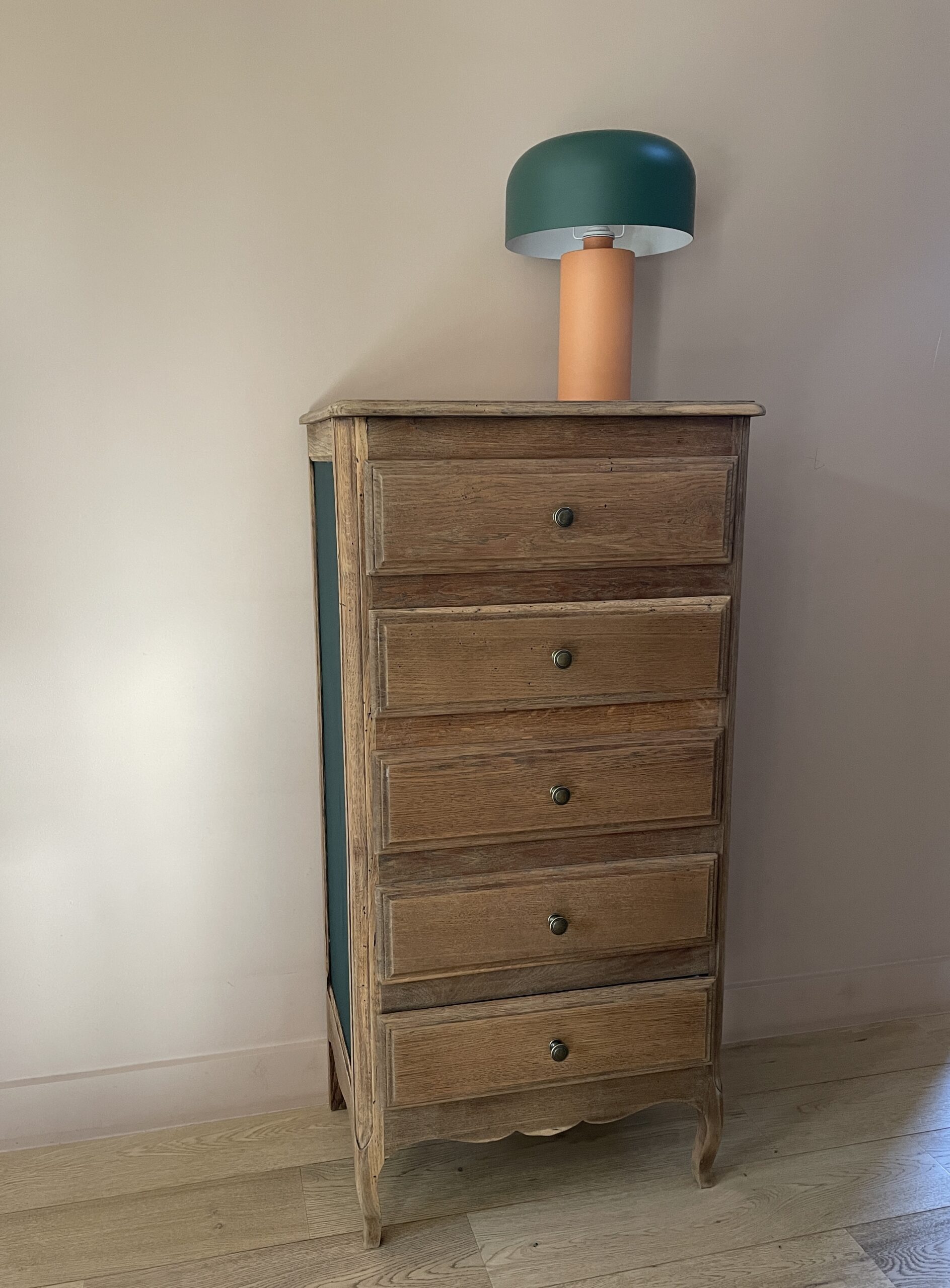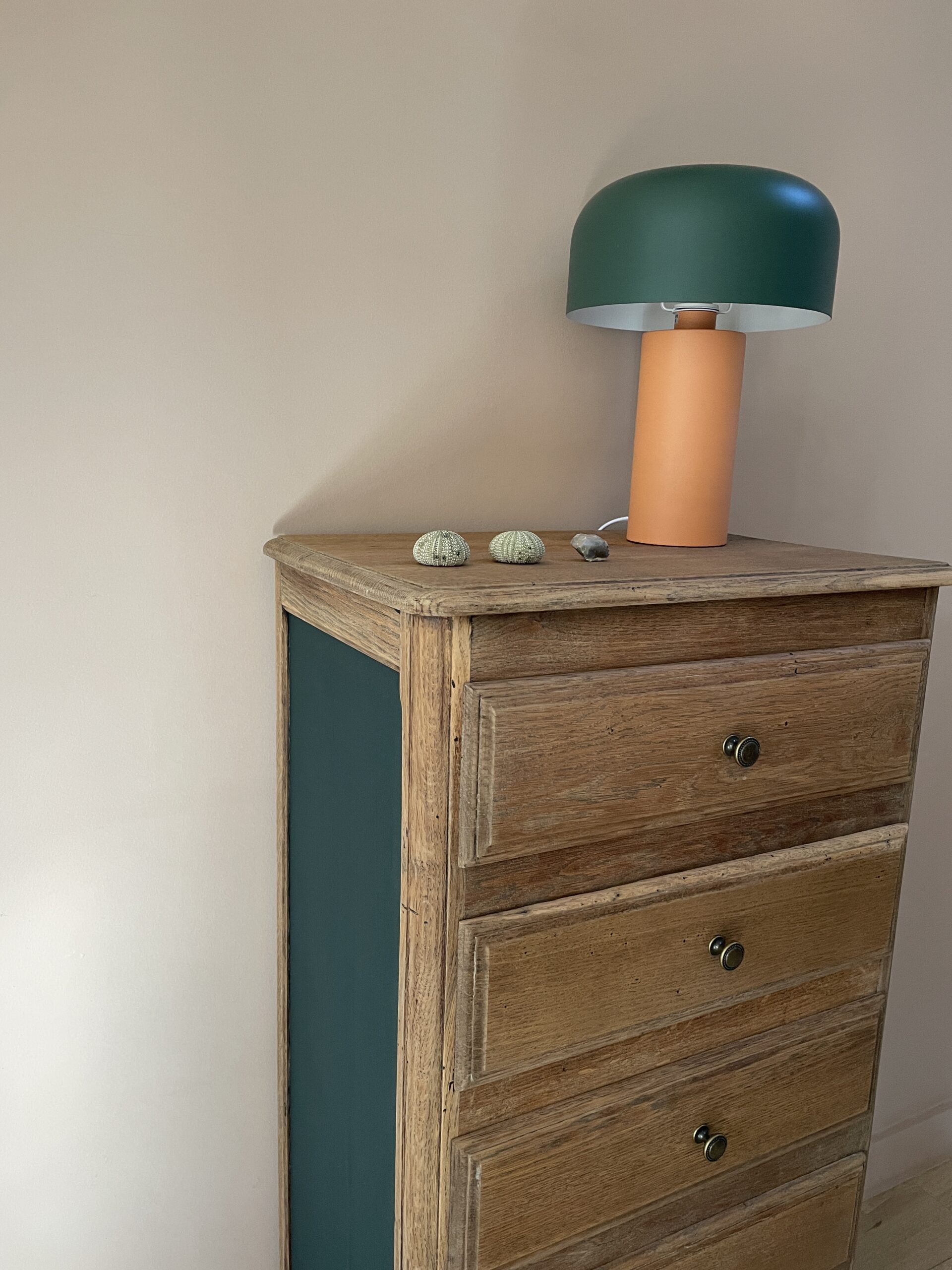 Côtés repeints en vert foncé Séquoia de chez Camaëlle, peinture biosourcée, fabriquée en France.