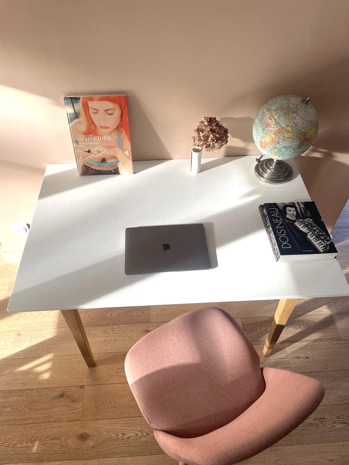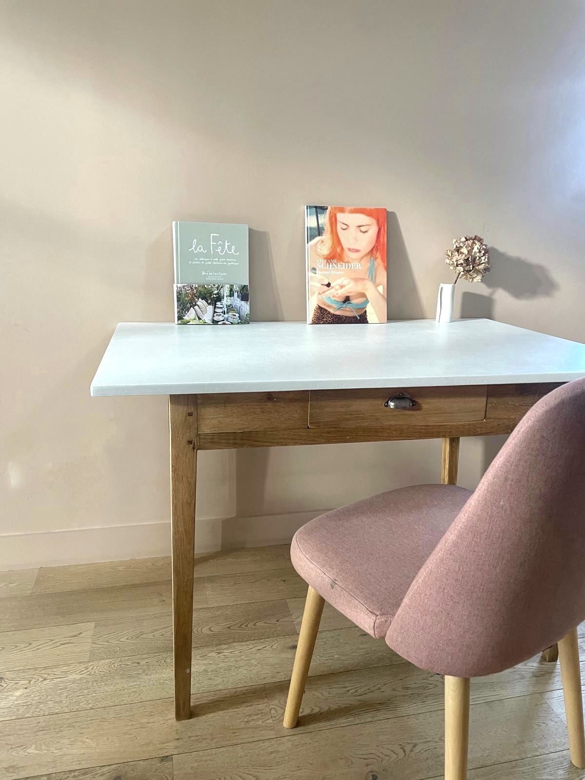 Table de ferme rénovée, plateau peint dans le coloris Porcelaine de chez Camaëlle, peinture française biosourcée.